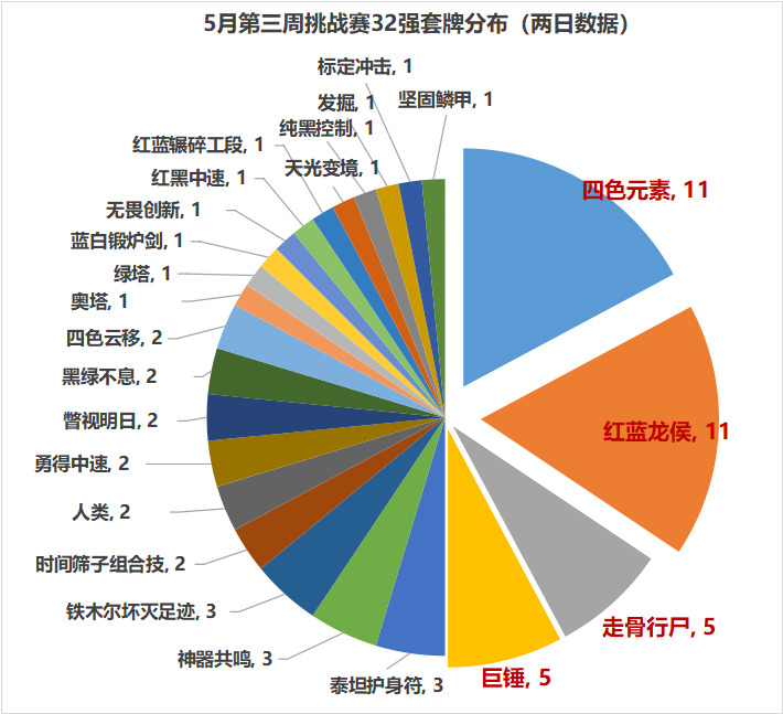 本周是四色元素全面席卷的一周,不仅进入32强的数量与红蓝龙侯并列第一,有11套牌,并且连续席卷了两场挑战赛,四色元素他又站起来了;第三名也是由走骨行尸和巨锤并列拿下,有5套牌进入32强。