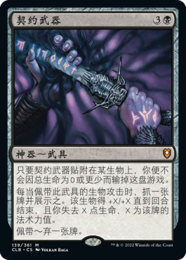不会因爲生命为0或更少而输掉这盘游戏的效果与生物佩带武具连结。团队希望佩带此武具的生物能持续变大,让牌手有一些可以用生物来抓牌的方式,这个概念让你的生命并非只是一般的生命而是资源。倒数第二个版本在精神上和最终版本相近,但如你所看到的,在效果上还进行了一些改变。