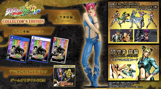 Bandai Namco Store独家收藏家捆绑包也可预购,价格为99.99美元,其中包括 Jolyne Cujoh 雕像、“动画特别活动颜色套装”代码和预购奖励代码 Jolyne Cujoh 服装“Green Dolphin Street State Prison”夹克。