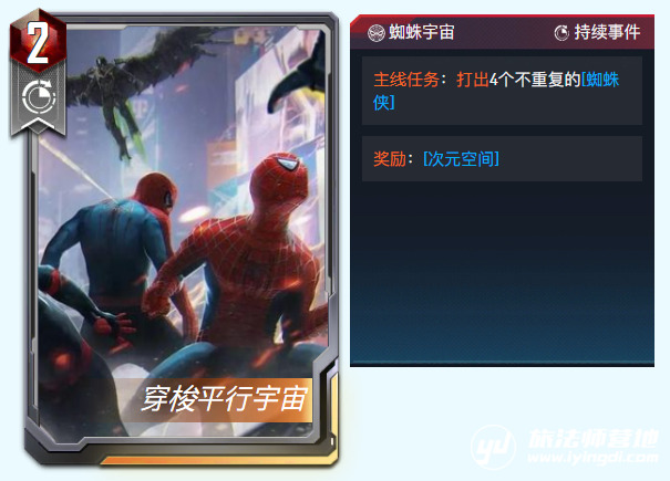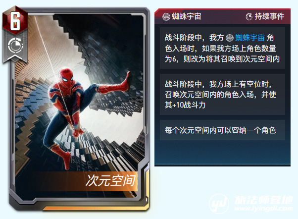 次元空间给予玩家更多的站位,玩家场上最多能存在4张次元空间,也就是最多能有10个角色在场。这就解决了后期蜘蛛宇宙蜘蛛侠(无回之战)或者究极蜘蛛侠召唤出单位没有地方存放的问题,给予蜘蛛侠更多的可能性。