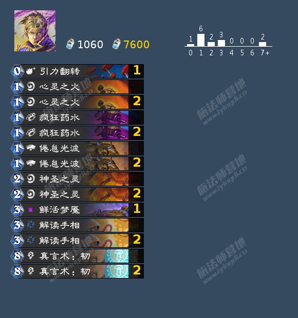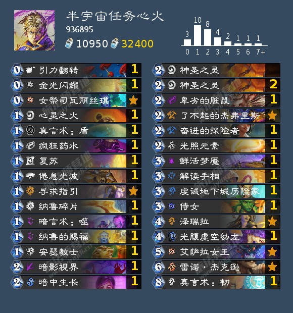 在绝大多数情况下是只能经过光照元素或者解读手相减一次费用,因此在心火的种类的选择上一般选择0费反转或者1费心灵之火。而考虑到存在一些局势需要或者可以靠自己站场来获胜,选择了2张攻击力等同生命值,1张交换攻击力和生命值的2+1选择。