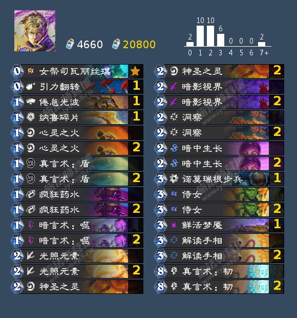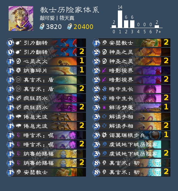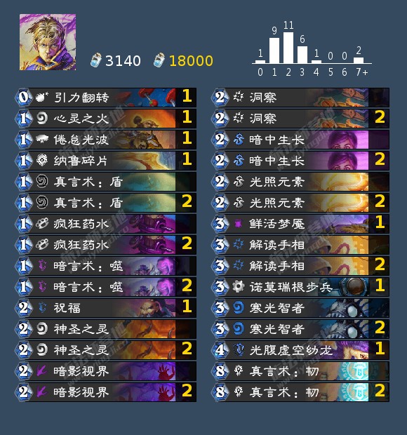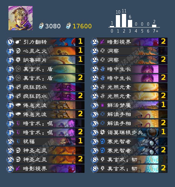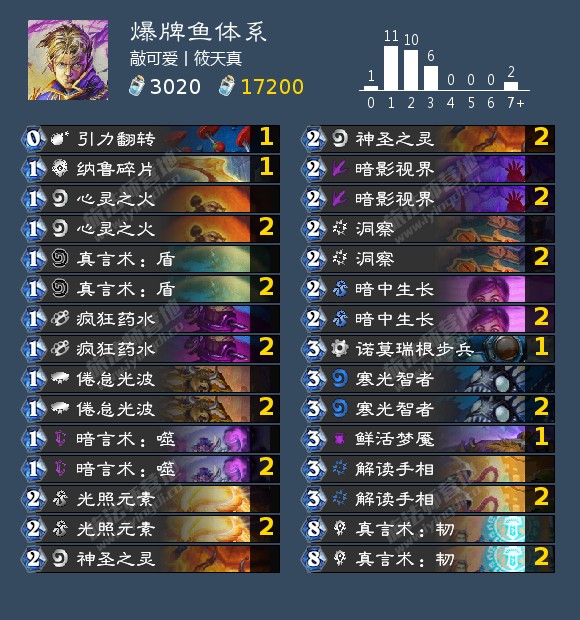 3. 洞察、暗中生长、暗影视界:牧师3大2费检索卡,对于这套卡组来说优先级洞察>暗中生长>暗影视界。洞察能增加我们卡组的剑圣,泽瑞拉的上手率,而且卡组只携带7随从,其中5个随从具有过牌特效,更容易打出一波大型aoe返场致胜。至于暗中生长和暗影视界,对于这卡组来说有心灵之火后更需要找神圣之灵,有神圣之灵更需要找心灵之火。暗中生长的压缩卡库更契合卡组,本构筑采取的是双洞察,舍弃了6张全带的选择加强了快攻抗性。