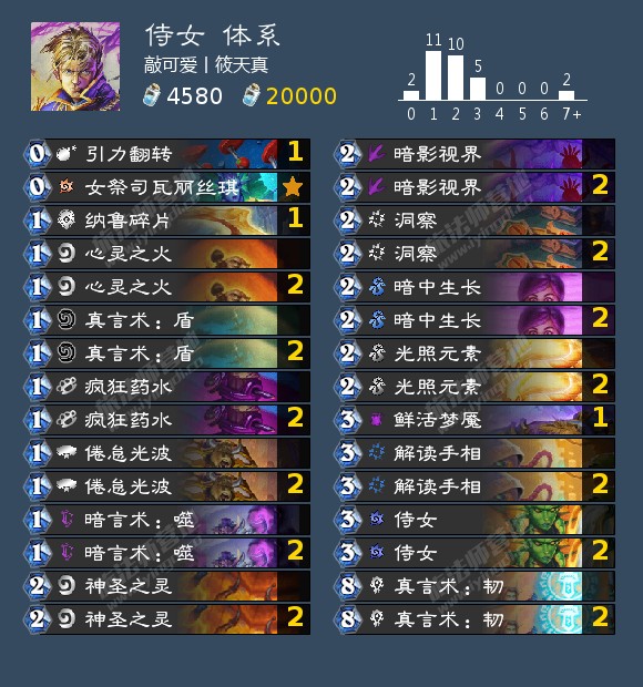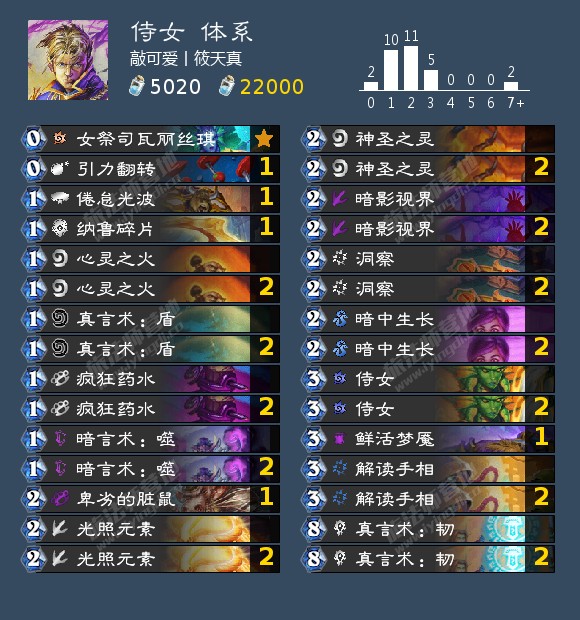 ②保留寒光智者体系的基本架构,寒光智者替换为侍女,冲锋替换为女祭司增加卡组流畅性。