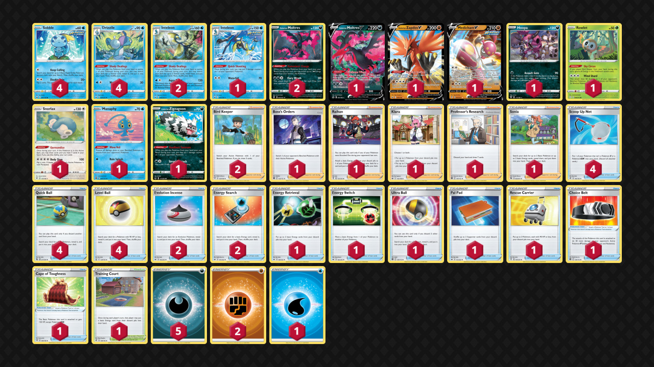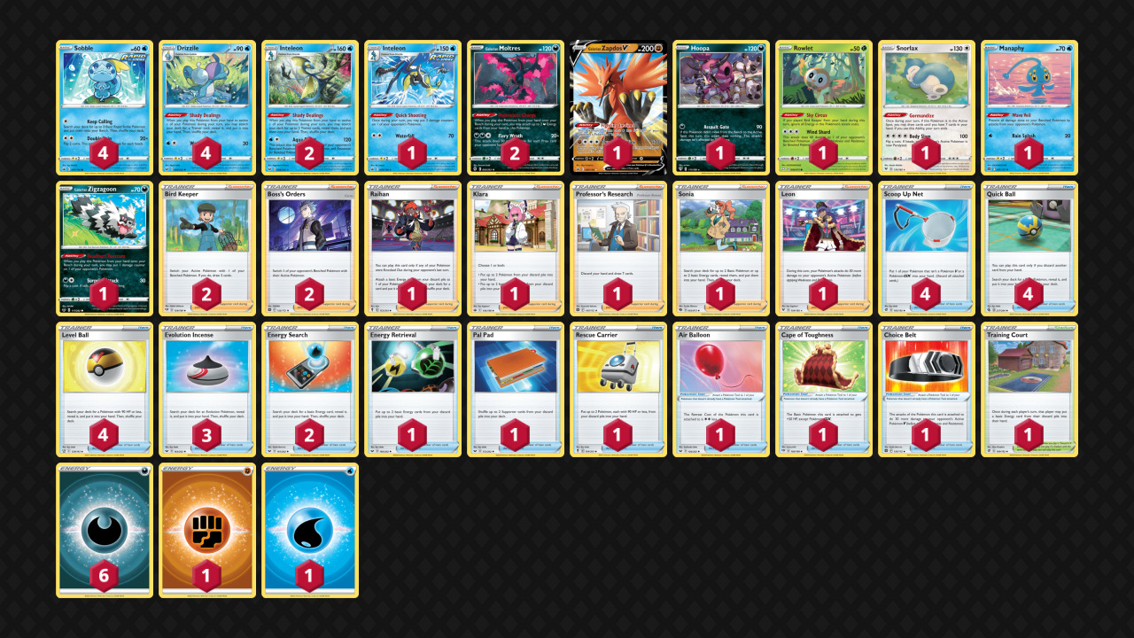 这个冠军卡组可以看做是之前欧洲ic赛大热的连击熊变种,由于连击熊的崛起导致比赛卡组中玛娜菲的投入剧增,连击熊的表现因此受到一定的限制,这个卡组用闪电鸟替代连击熊作为斗系打手应对阿尔宙斯,卡组中的恶系组件依旧是梦幻最大的克星,养鸟人木木枭的组合也因为启动快,易达成,代价低而让对手不容易防范,经常在第一第二回合就可以打出去趁对手还未拍下玛娜菲时偷掉对手后排的泪眼蜥或者土龙弟弟等60hp以下的宝可梦。