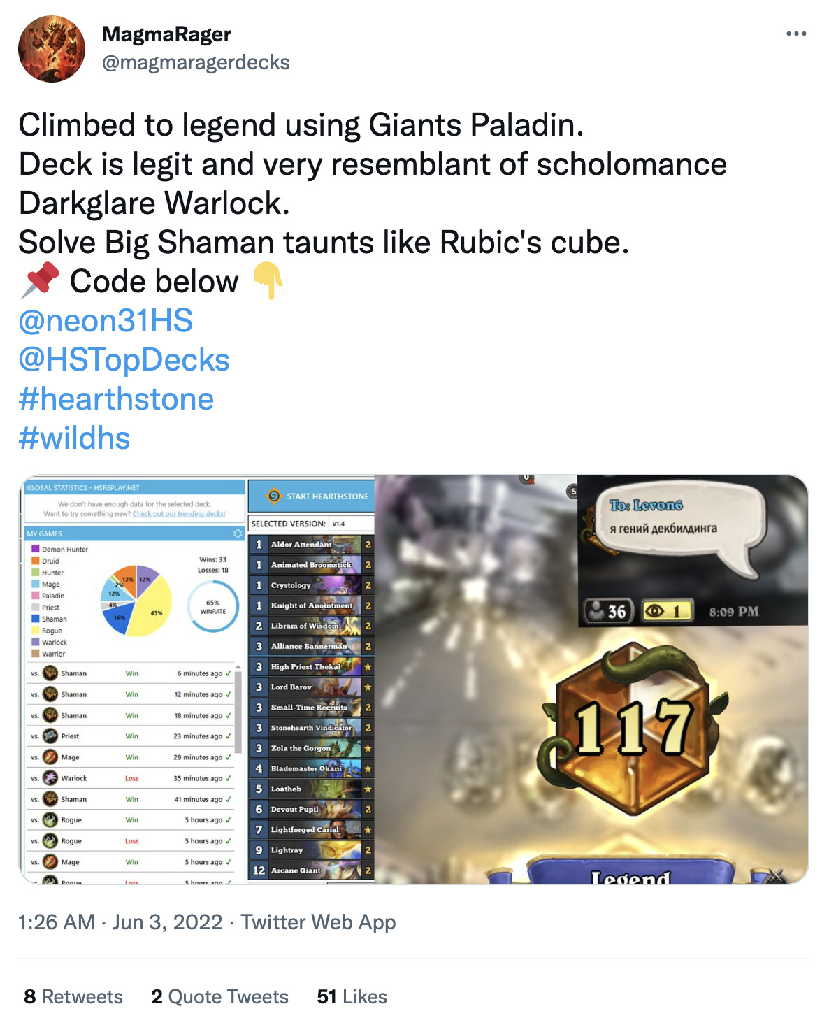 总有人喜欢把一个职业的套牌和另外一个职业的比较,意义不大,参考价值也不大,每个职业都有自己的职业特性,食物链是一直存在的。而我想坚守骑士,我就需要顺应骑士的特点,确实,术士过牌快能提早很多下巨人;贼的快速启动能不给我们充足的过牌机会。但每个职业各有优点和缺点,无法避免。骑士最为强力的终结手段是螃蟹骑士+花园惠景,但我愿意放眼新的手段方式,这也是炉石构筑的乐趣。一个新思路的构筑过程是艰难的,也是需要时间的,这个套路、套牌的强度我希望最后可以靠时间来堆砌出来,我会坚持的。
