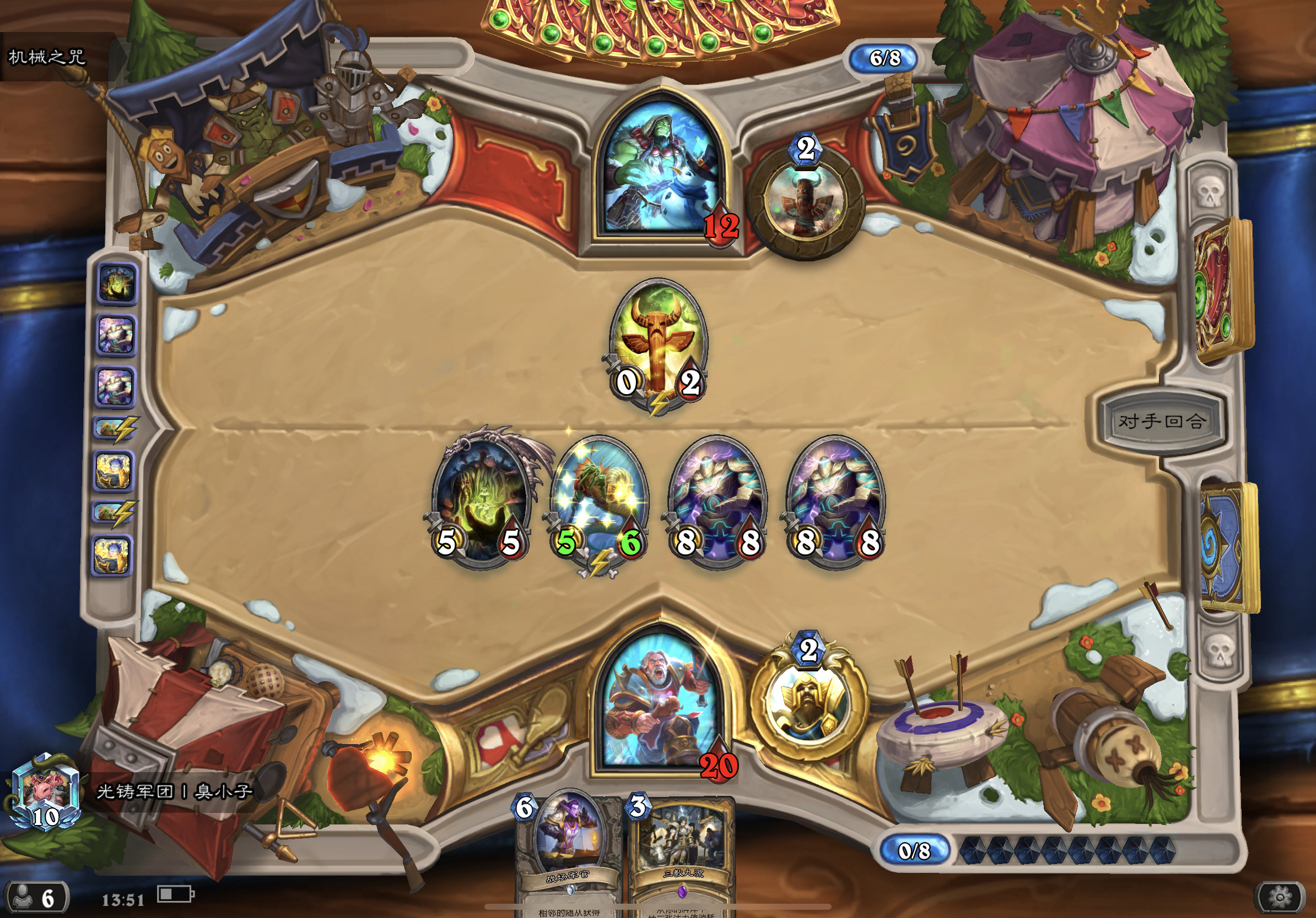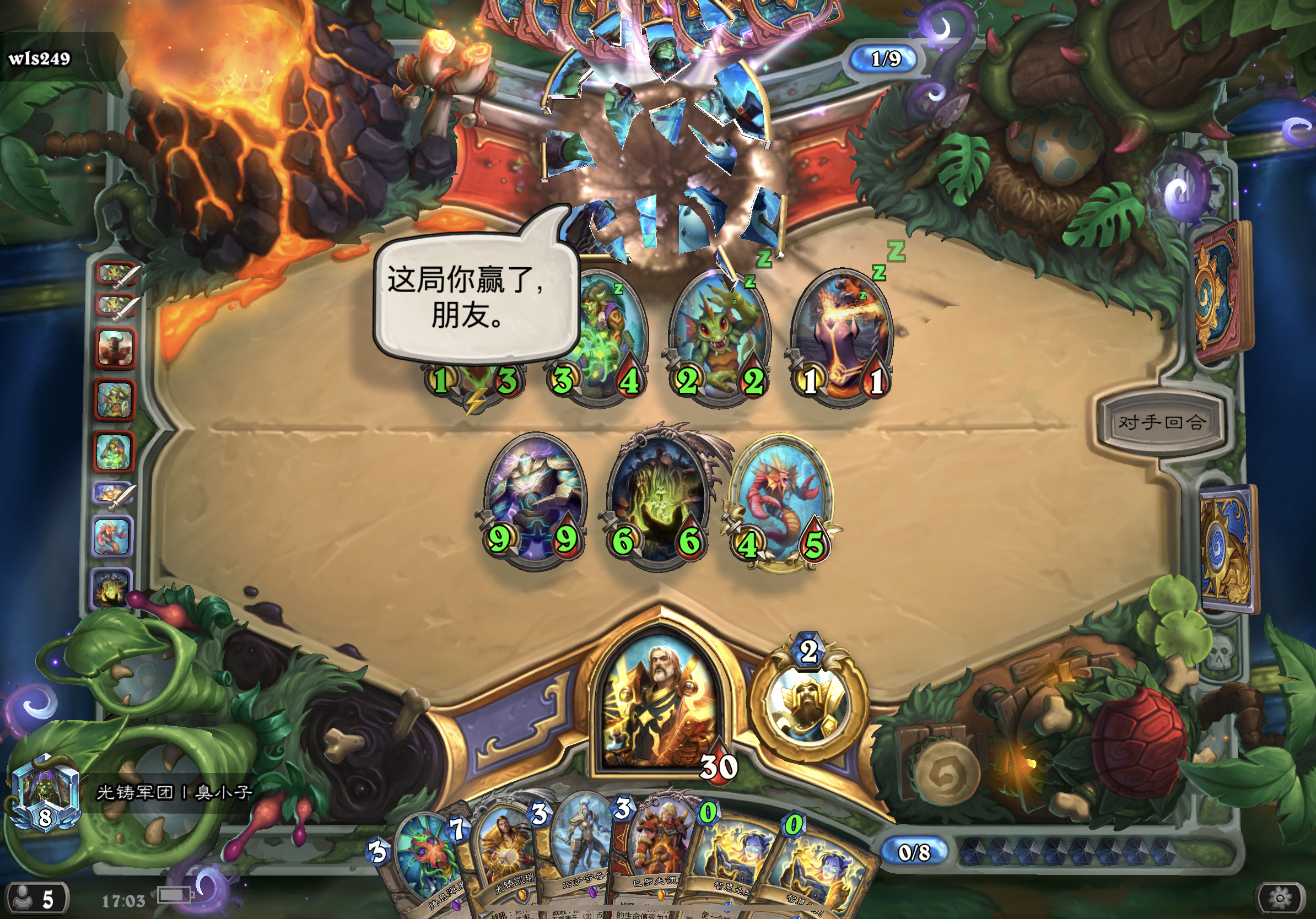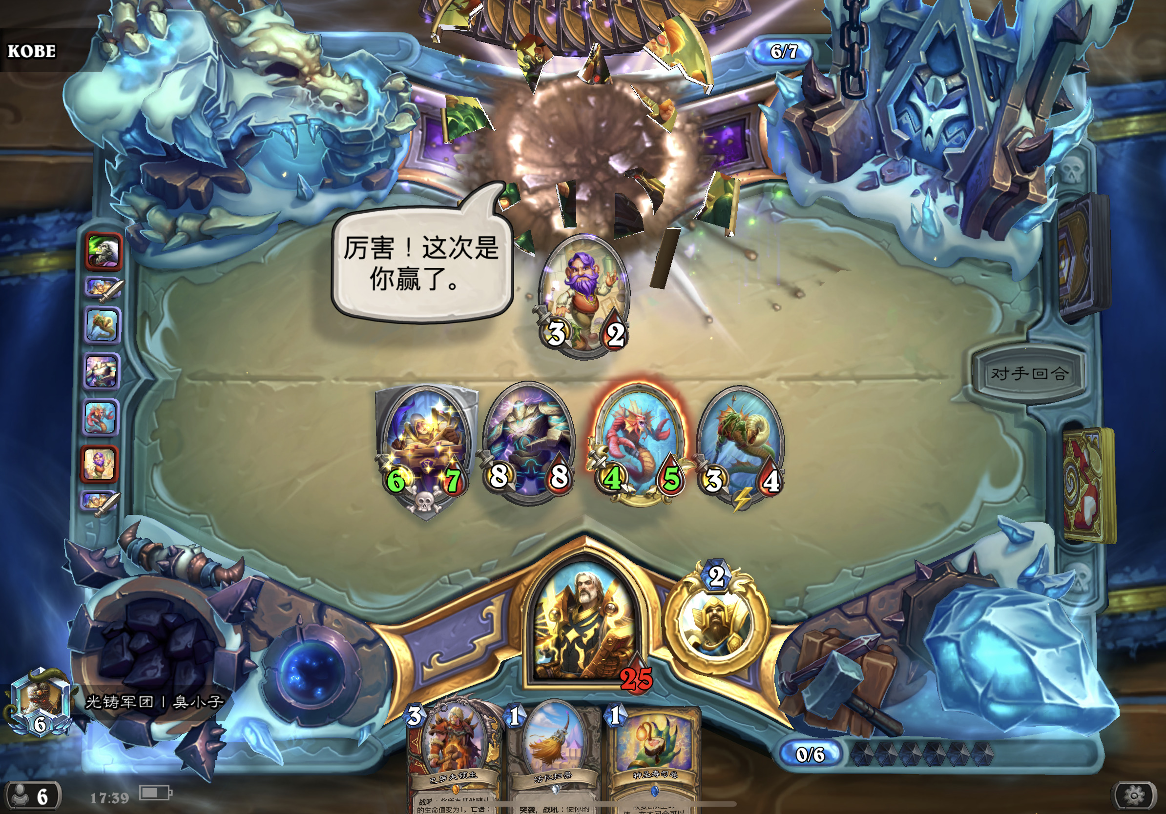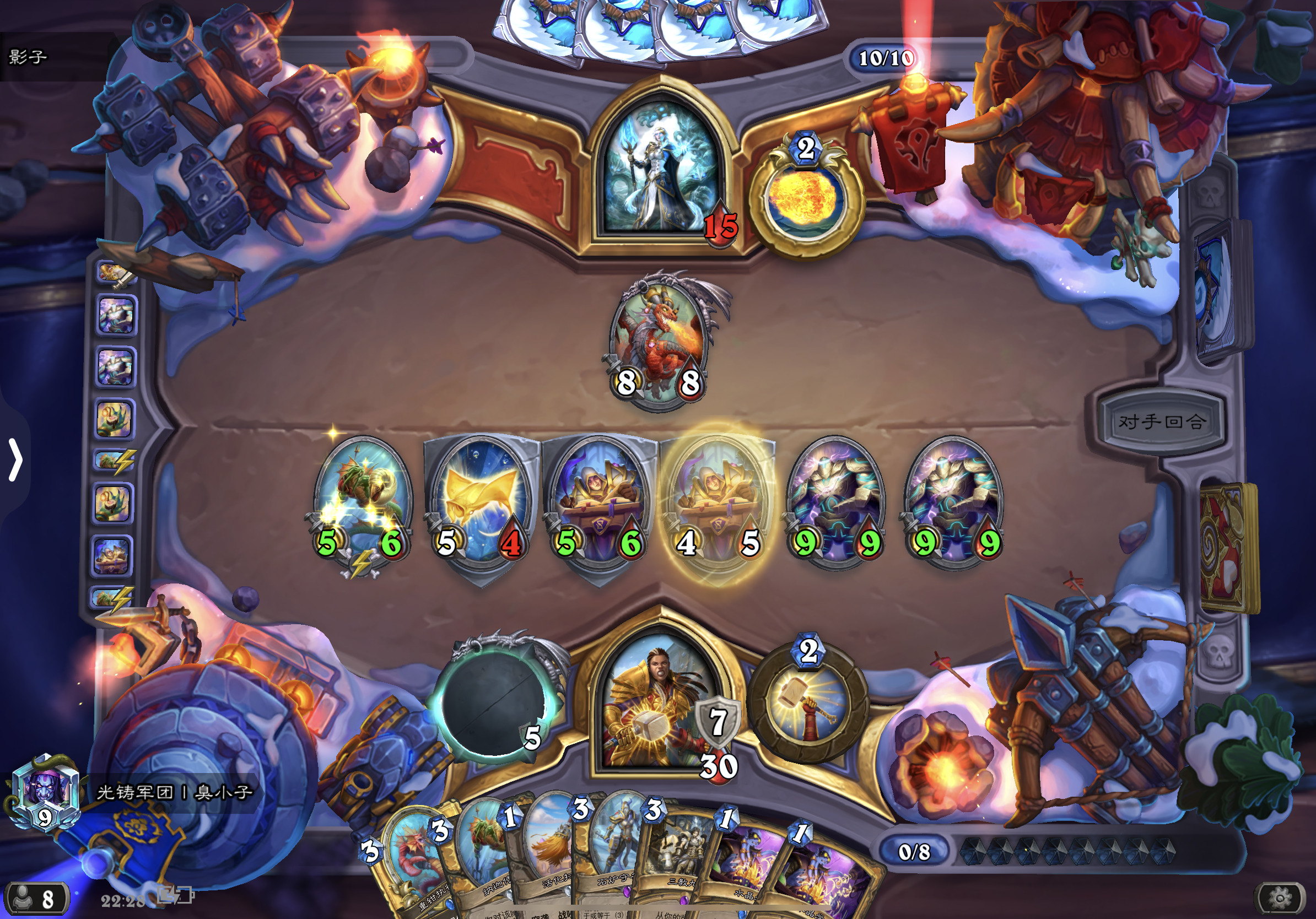 术士的解牌太多了……,记得骗。笔记:面对解牌多的职业,尽量在场上留圣盾随从,以便于后续的场面优势,像我这把就是场上留着一个学徒,然后对手用6个水晶把我的场面解到就剩一个学徒,随后以我的经验,偶数术一般都是只有一个632,所以就直接全部压场了(同时也防了暗影烈焰)。同时我的手里甚至还有寿司卷能配合334继续刷牌,还有一个扫把可以用来场面交换。