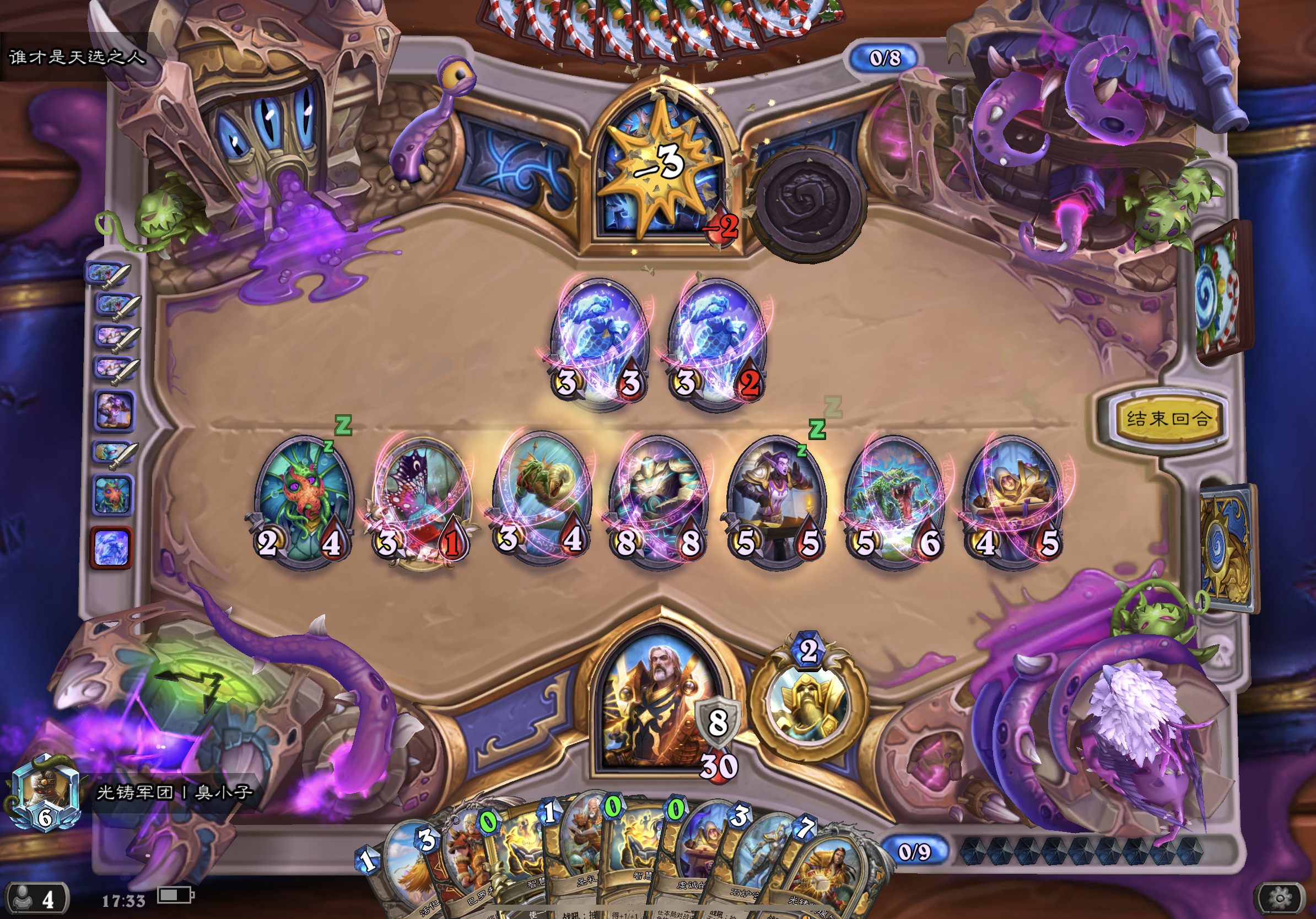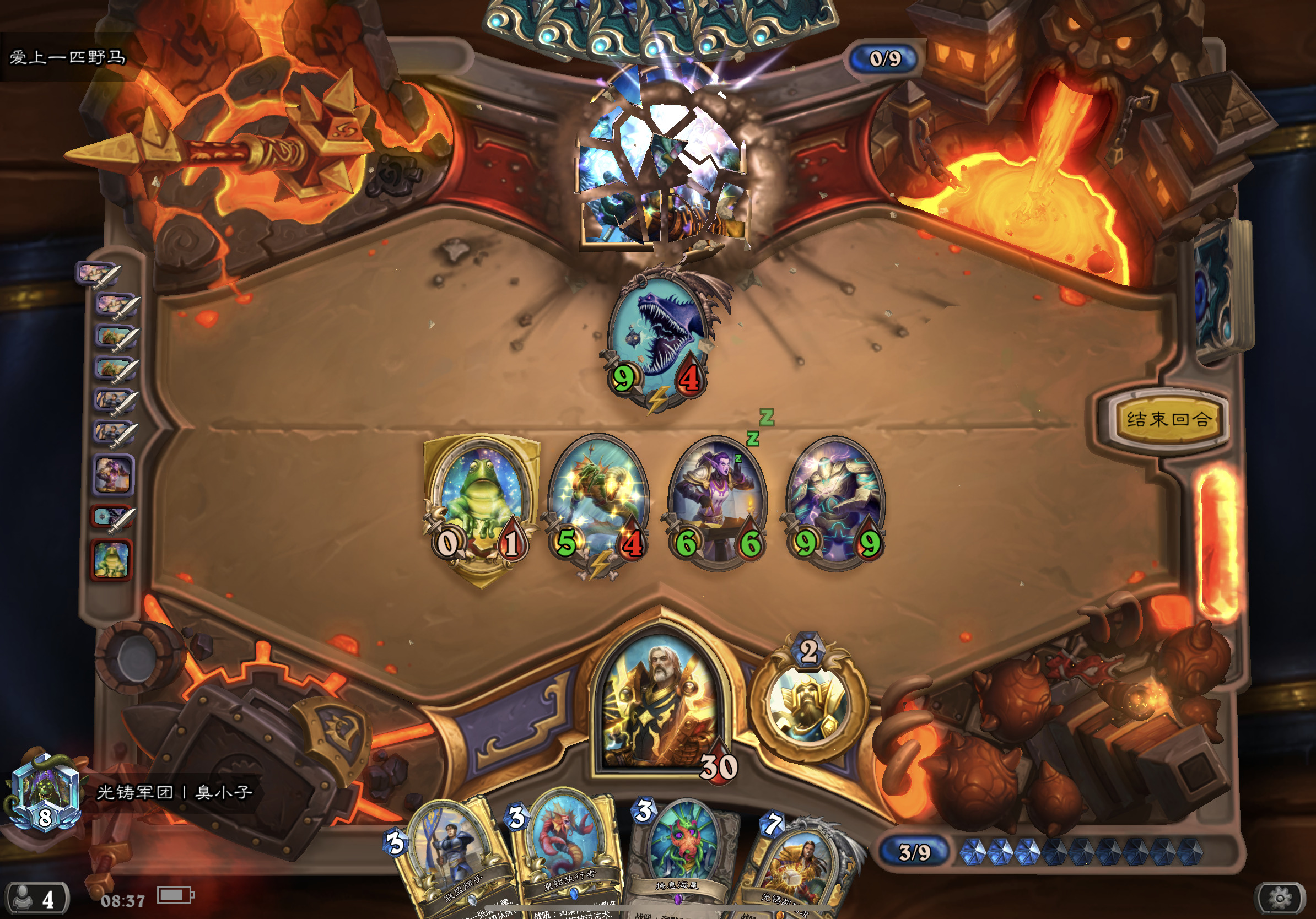 这把是我打上低保的一局(我是10星选手orz),这是带战吼任务的战吼萨,需要注意的点是防衰退!防衰退!防衰退!可以看到我斩杀的时候圣契都还在手里(绝对不是忘记打了),打萨满真的是最繁琐的对局,要一直防衰退,我的方法是确保手里最好有两个圣契。这把对手上个回合用一个雪崩冰我,然后下回合直接技能(2倍战吼)+第二个雪崩再冰我,但是被我的海星+军官斩杀了。要知道88巨人和55光鳐也可以防衰退,特别是光鳐,往往会越退越大。
