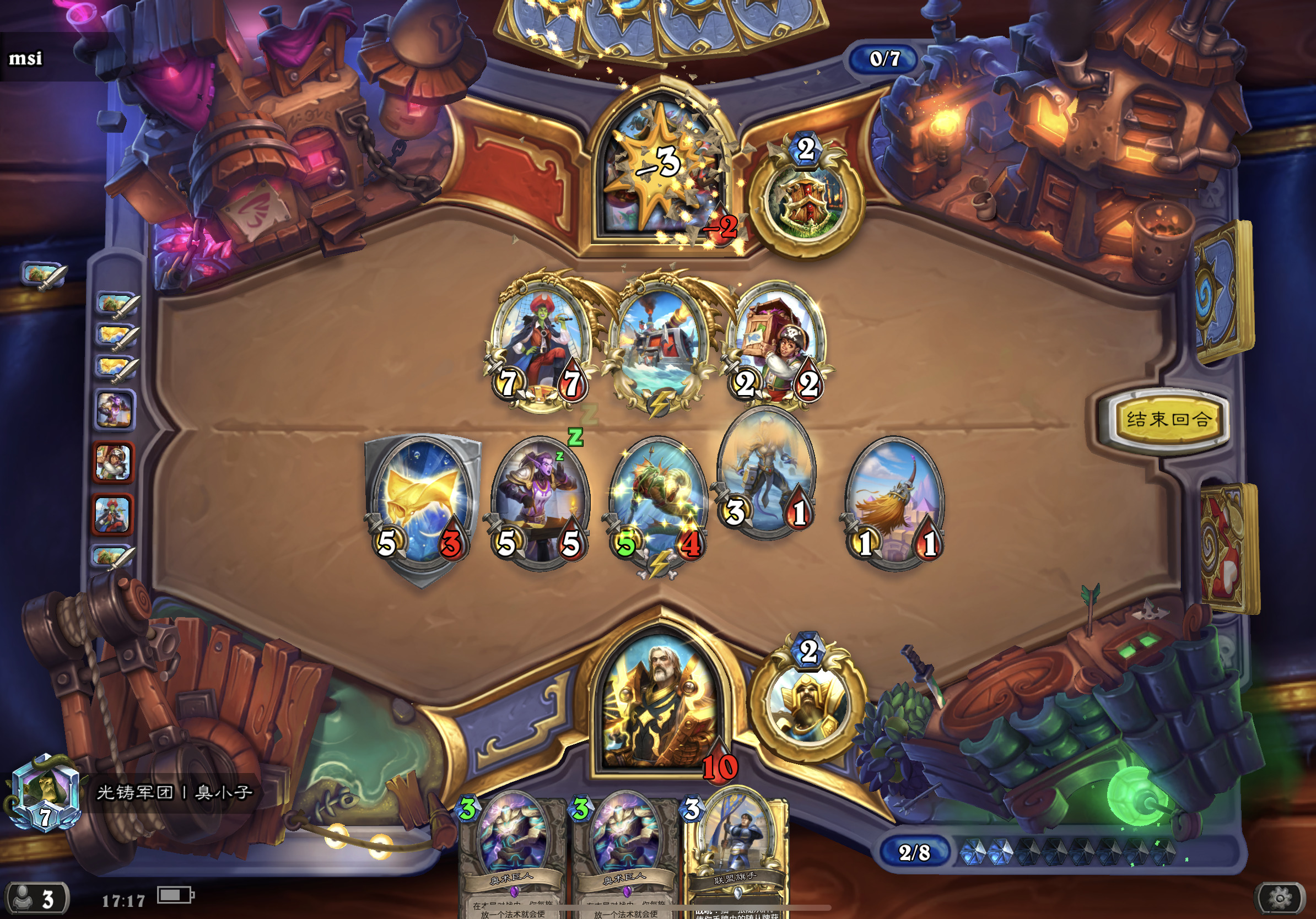 宇宙萨的过牌和资源都是领先于平均水准的,这把的对手7费214锤喙配合老师直接开始刷小学生,我记得刷了闪电风暴、叉状闪电,加上他自己下老师找的一个冰霜撕咬,压力不小。笔记:要在萨满没开始刷资源前不断给场面压力,同时还要注意用扫把来交换场面(记住留两个空位),最后可以在取得场面优势后1)如果抽到塞布,直接压,赌对手没有雪崩;或者2)没有抽到塞布,就用圣契继续刷费用,以及过牌巩固优势。