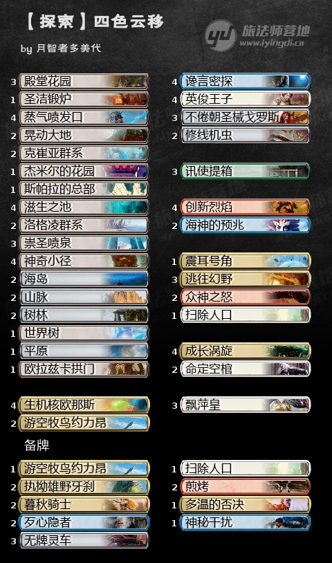 创新烈焰、谗言密探、游空牧鸟约力昂:相信玩过依克黎标准的人都知道密探抢人→约力昂云移走密探和烈焰→继续施放下一~N个咒语→回合末密探回场再抢一个人的一套combo有多不要脸,这里也不多赘述了。由于套牌80张的限制,烈焰和密探都满编4张提高上手率,约力昂则采取主牌2+行侣的配置。