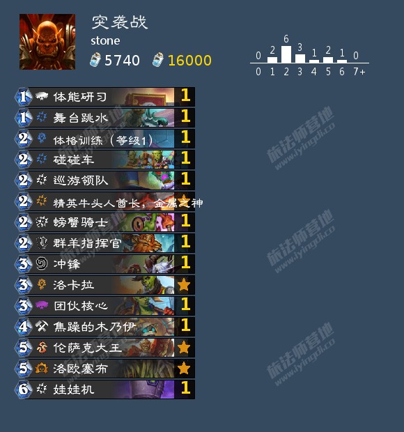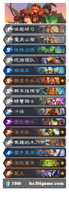 一个很稳定,很强的卡组,随从体系的爹,村内有些弱,经常一条命打12胜。解场能力max,站场能力max,只有打法系的时候劣势,所以出于这个考虑带了洛欧塞布。一张卡就能针对菌丝德,瘟疫萨,炸弹战,任务伊利斯,养猪铜须。这里就不得不提我打了10-3的一轮,前10把打了9把法系+控制体系,嗯,这就是美服的环境吗。除此之外,我还带了3费的冲锋,因为对决村内血量少,所以挺容易偷鸡的,2级的体格训练+螃蟹骑士+冲锋=10血=半条命(当然一切以节奏为主,不要为了偷鸡而放弃节奏)。然后,由于英雄是铜须,并不能稳定的抓到战士的突袭词条,所以十分依靠抓到的宝藏牌。这里提名一些抓位高的宝藏:远古映象->配合牛头人,鼠王,对面的机械鲨鱼等;巨额->神刀,配合碰碰车,山羊,鼠王能养出十几攻的大刀。
