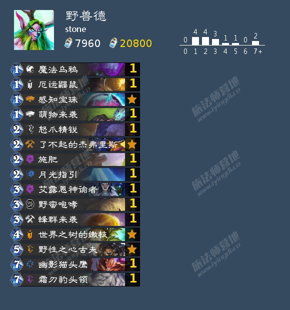 野兽德这个体系呢,我在5月初就构筑好了,并打了几个12胜了,然后中旬的时候在群里提了一嘴,然后群友对构筑进行了修改,然后这就是我最后敲定的这一版。为什么我会想到构筑野兽德呢?一直有人在说什么机械法歪全法,海盗贼歪全法,鱼人术歪全法-->野兽德歪全法,就很棒。这是第一个原因。第二个原因就是,菌丝德的强度完全是靠古夫+双刀,然后我们看看野兽德有啥?哦~有饥饿,每死个野兽抽一张,不久等于急速过牌嘛,然后,野兽德你得下野兽不,那不就是场面了嘛。所以对比纯菌丝德,野兽德是要有场面有场面,要有过牌有过牌,然后过牌快就等于更快的拿到古夫双刀就等于更快的跳费。好家伙完爆了(乐)。