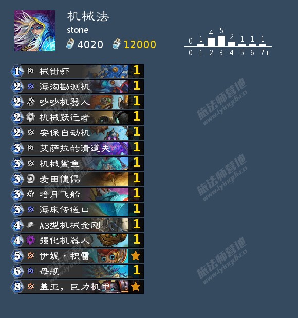 在还有护目镜的时候,我会去掉械钳虾,带上艾露尼斯。现在护目镜不能稳定出了,就带上械钳虾,因为对于所有适配2宝都是加分项。其实我并不是很喜欢玩机械法,挺无聊的。而且,机械法的抓牌有概率会歪,第二抓的时候看到碎雪机器人/煤烟喷吐装置/烈焰巨兽的时候就想扇发牌员一巴掌,有护目镜的时候还能继续打一打。。。