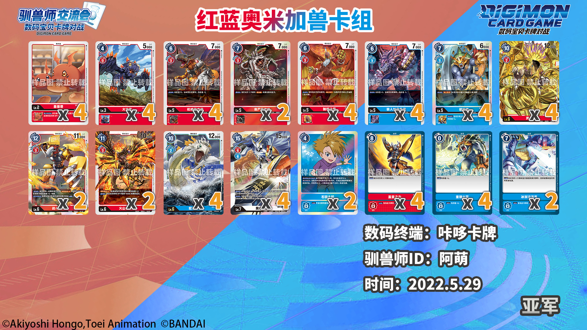 “阿萌”选手使用红蓝奥米加兽卡组在芜湖咔哆卡牌 5月29日的8人比赛中获得亚军,本次上位卡组类型分布统计中,仅统计到了1套该类型卡组,属于其它板块。