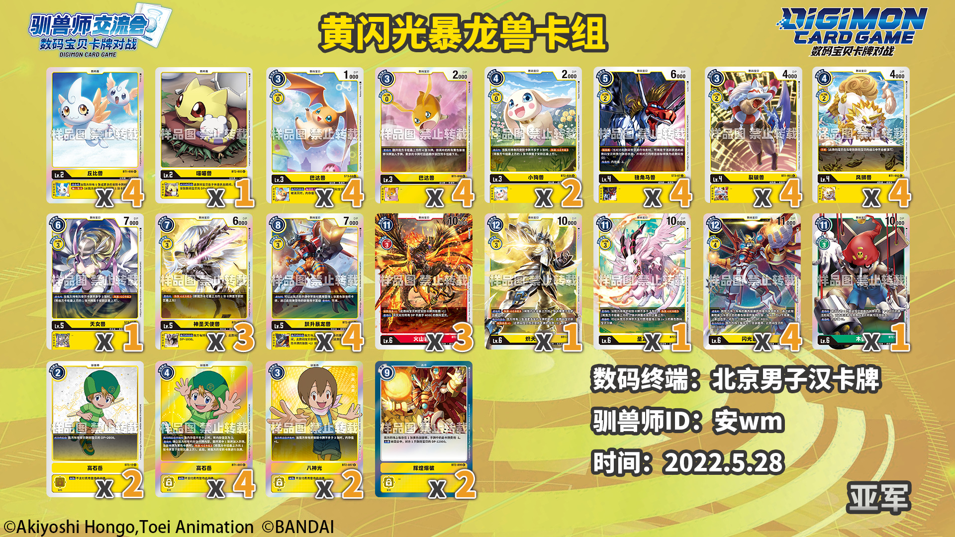 “安wm”选手使用黄闪光暴龙兽卡组在北京男子汉卡牌 5月28日的10人比赛中获得亚军,本次上位卡组类型分布统计中,共统计到了50套该类型卡组,使用率19%。冠军卡组构筑分布中统计到了13套该类型卡组,占比20%。
