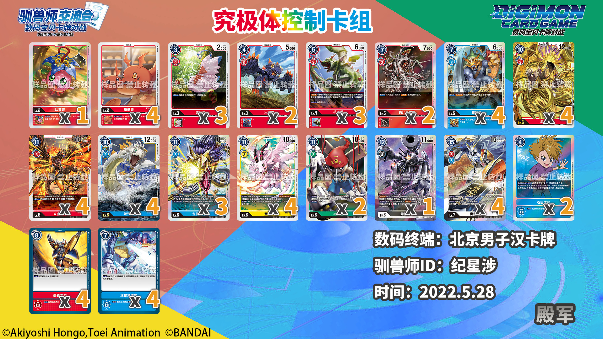 “纪星涉”选手使用究极体控制卡组在北京男子汉卡牌 5月18日的10人比赛中获得殿军,本次上位卡组类型分布统计中,仅统计到了1套该类型卡组,属于其它板块。