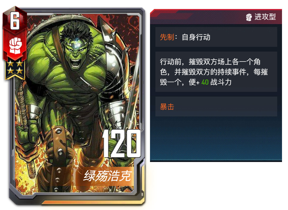 创作理念:浩克目前两张都有些鸡肋,故补上这张,有人说傻大个没有用,那能拆爆炸的傻大个呢/doge/,作为绿殇,暴击和红队必不可少,因为被光照会放逐,然后又被炸死老婆,绿殇与托尼等超英不共戴天,故失去复仇者词条