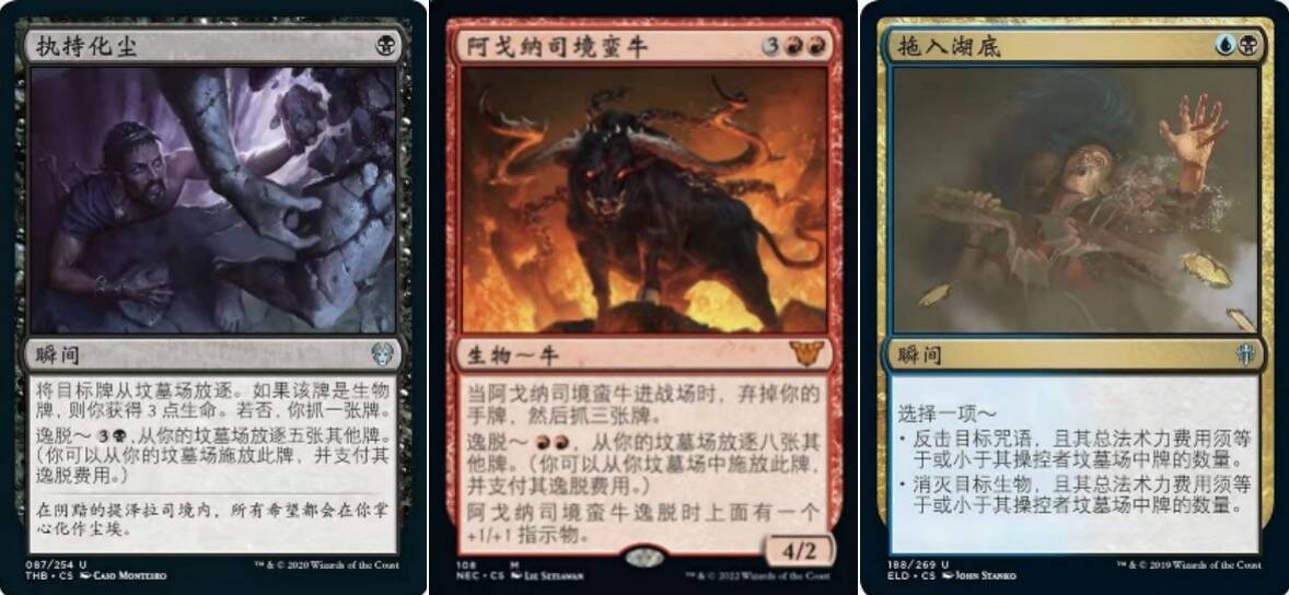 让我们来看看这个回合中的堆叠中发生了什么:Javier施放了阿戈纳司境蛮牛,而Arne不仅要处理牛的第一次进场,还需要阻止牛从坟场中逸脱。如果Arne仅仅是康掉牛,那么Javier作为持有优先权的一方可以在牛被执持化尘之前逸脱出来。所以Arne选择在堆叠中再加入一个自己的咒语来获得优先权:他首先用拖入湖底指向Javier的旅店主,再施放第二张拖入湖底反击蛮牛。这样做的好处就是在蛮牛进入坟场时,由于堆叠中仍存在Arne的第一个拖入湖底没有结算,Arne有优先权来施放执持化尘放逐蛮牛,这个操作为他奠定了胜局!