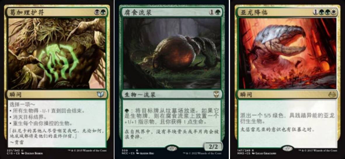 他选择支付一点绿把流浆变成5/5,大到足以和对手的亚龙完成交换,但这远没有结束。通过这一操作,市川给对手制造了一个两难的选择:如果Cunningham选择让过,且他假设市川手里也没有招,那么至少他可以换掉这只后续难以处理的腐食流浆,但是如果这样做的话他手牌中的这张白绿护符大概率会变成一张在几个回合内都难以使用的单卡。所以,Cunningham选择使用白绿护符并选择放逐一张力量大于5的生物这个选项(仅仅+2/+2不足以应对最大可以膨胀到8/8的流浆)。自此,所有前置博弈完成,市川施放葛加理护符并选择了所有生物-1/-1。葛加理护符使得流浆变成4/4,躲过了瑟雷尼亚护符的射程,然后流浆再次启动异能变成5/5挡死了对手的4/4亚龙衍生物。更妙的是,因施放葛加理护符而触发对手复苏之音异能造出来的元素衍生物也在亚龙死后被减死(葛加理护符所有生物-1/-1的效果持续到回合结束)。从视频中不难看出市川的操作很快,显然是早就想到了这一场景。那么同样作为一名高水平牌手,难道Cunningham没有想到这一结局么?事实上,虽然这个场面确实出乎所有人的意料,但我认为更多的是场上还未变身的异形地窖干扰了Cunningham的判断。