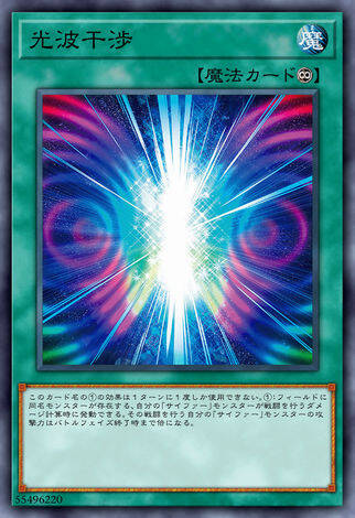 效果:这个卡名的①②效果1回合各能使用1次。①:可以以场上的2只等级6以下的同名怪兽为对象发动。那些怪兽的等级变为2倍。②:自己或对手的战斗阶段开始时,可以以自己场上的1只「光波」怪兽为对象发动。选那只怪兽以外的场上的1只表侧表示怪兽,直到结束阶段其卡名当作作为对象的「光波」怪兽的同名卡使用。