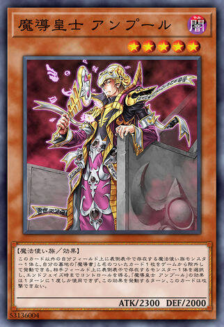 效果:把这张卡以外的自己场上表侧表示存在的1只魔法师族怪兽和自己墓地1张名字带有「魔导书」的卡从游戏中除外才能发动。选择对方场上表侧表示存在的1只怪兽直到结束阶段时得到控制权。「魔导皇士 安普尔」的效果1回合只能使用1次,这个效果发动的回合,这张卡不能攻击。