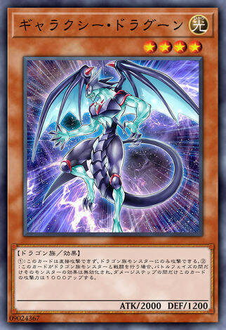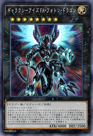 效果:①:自己场上有「光子」怪兽或者「银河」怪兽存在的场合,这张卡可以不用解放作召唤。②:这张卡的①的方法召唤成功的场合,以自己墓地1只「 银河眼光子龙 」为对象发动。这张卡的攻击力直到回合结束时下降1000,作为对象的怪兽守备表示特殊召唤。