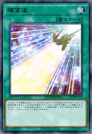 效果: 这张卡发动的回合,自己不能用这张卡的效果以外把怪兽特殊召唤。①:以自己墓地3只怪兽为对象才能发动。那3只怪兽效果无效特殊召唤,只用那3只为素材把1只「霍普」超量怪兽超量召唤。