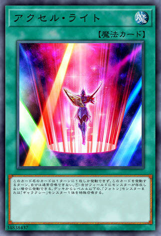效果:这个卡名的卡在1回合只能发动1张,这张卡发动的回合,自己不能通常召唤。①:自己场上没有怪兽存在的场合才能发动。从卡组把4星以下的1只「光子」怪兽或者「银河」怪兽特殊召唤。