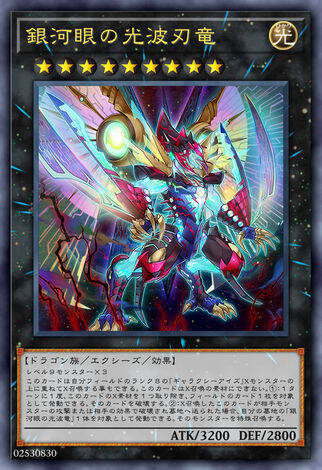 这张卡也能在自己场上的8阶「银河眼」超量怪兽上面重叠来超量召唤。这张卡不能作为超量召唤的素材。 ①:1回合1次,把这张卡1个超量素材取除,以场上1张卡为对象才能发动。那张卡破坏。 ②:超量召唤的这张卡被对方怪兽的攻击或者对方的效果破坏送去墓地的场合,以自己墓地1只「银河眼光波龙」为对象才能发动。那只怪兽特殊召唤。