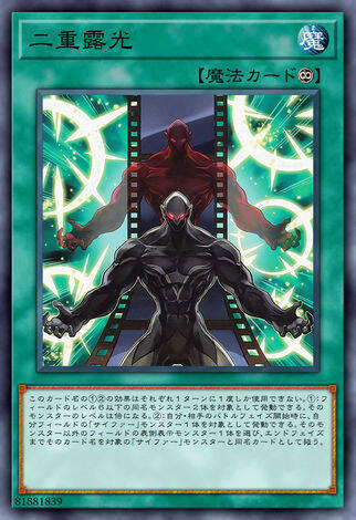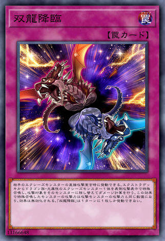 效果:对方的超量怪兽的直接攻击宣言时才能发动。从额外卡组把1只龙族·光属性的超量怪兽表侧攻击表示特殊召唤,攻击对象转移为那只怪兽进行伤害计算。这个效果特殊召唤的怪兽的攻击力变成和攻击怪兽的攻击力相同数值,效果无效化。「 双龍降臨 」在1回合只能发动1张。