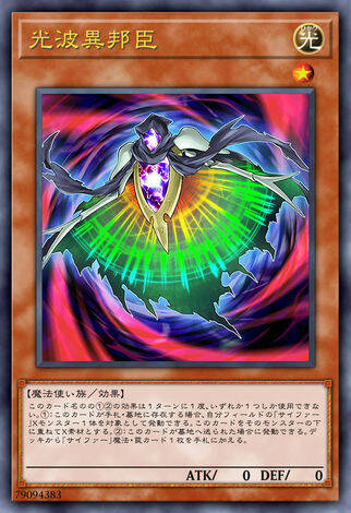 效果:「 光波异邦臣 」的①②的效果1回合只能有1次使用其中任意1个。①:这张卡在手卡·墓地存在的场合,以自己场上1只「 光波 」超量怪兽为对象才能发动。把这张卡在那只怪兽下面重叠作为超量素材。②:这张卡被送去墓地的场合才能发动。从卡组把1张「 光波 」魔法·陷阱卡加入手卡。