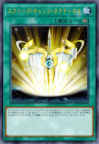 效果:①:「超量变身战术」在自己场上只能有1张表侧表示存在。②:自己场上有「希望皇 霍普」怪兽超量召唤时,支付500基本分才能发动。自己从卡组抽1张。