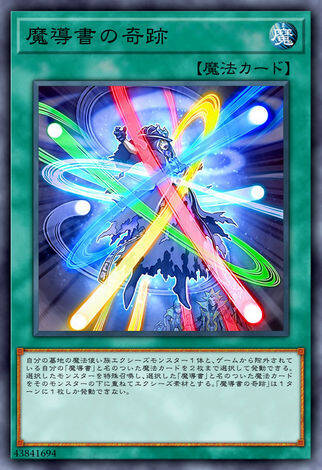 效果:选择自己墓地1只魔法师族超量怪兽和从游戏中除外的最多2张自己的名字带有「魔导书」的魔法卡才能发动。选择的怪兽特殊召唤,把选择的名字带有「魔导书」的魔法卡在那只怪兽下面重叠作为超量素材。「魔导书的奇迹」在1回合只能发动1张。