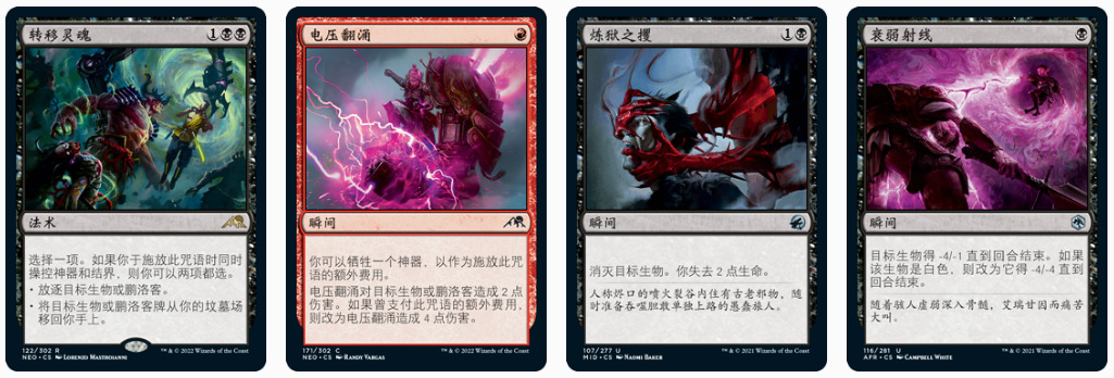 我们在合适的对局换入高效的衰弱射线和抹除,消耗对局进主额外的艾弗琳和转移灵魂,风化侵蚀、逼从和反击咒语则是应对强力威胁的好牌。在有些对手去除的对局中,夺心魔也是能为比赛带来巨大影响的牌。在去除没什么用的对局我们会酌情下掉些最差的,和套牌主计划不那么相关的漆月魁度和顽强败犬也是经常被换出。