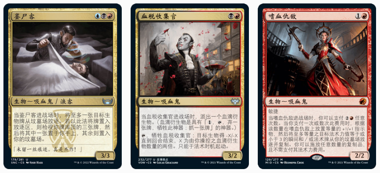 套牌的吸血鬼曲线采用了血税收集官、嗜血仇敌、鉴尸客,这些生物的共同点就是进场即赚,跟奇奇结界配合极强,不被打断就会在两回合内赚到足够致胜的资源。三回合的鉴尸客能正好吃掉2回合交换进坟的顽强败犬并深度滤牌,是非常合理的中期曲线。除了败犬外,T2环境还有无常神和歹心隐者这样的生物可吃,而这些能爬出坟场的生物正是格利极这种去除中速所害怕的。