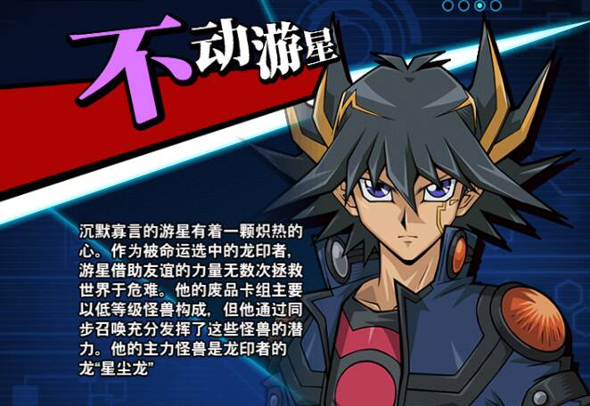 不动游星是游戏王5DS的主角,使用废品卡组和星尘龙。在故事中不断集结伙伴向意图毁灭世界的反派决斗者发起挑战。先后击败了龙印者的宿命对手暗印者、制造混乱的伊利亚斯特尔和妄图毁灭决斗怪兽的来自绝望的未来的敌人。在剧场版中和游戏、十代一起拯救了决斗怪兽。在动画结尾继承了父亲的衣钵,成为了研究永转机和游星粒子的不动博士。