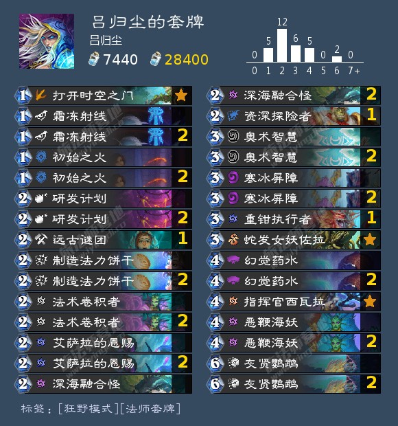 小tips:对局中法术卷积者,遇到卡手或者手牌有恩赐可以1费任务2费直接打,其他情况尽量留作子弹做任务,永恒之火和霜冻射线可在启动时回2费方便下3费纳迦和奥术智慧,没开的饼干、0费冰箱同理。打需要用到冰箱的对局,冰箱能不打就不打,留作配合指挥官达成多冰箱(对局用不上冰箱的对局,类似开门法内战,宇宙体系,冰箱尽量能打就打,别记录指挥官,卡手)