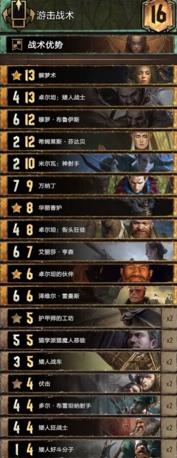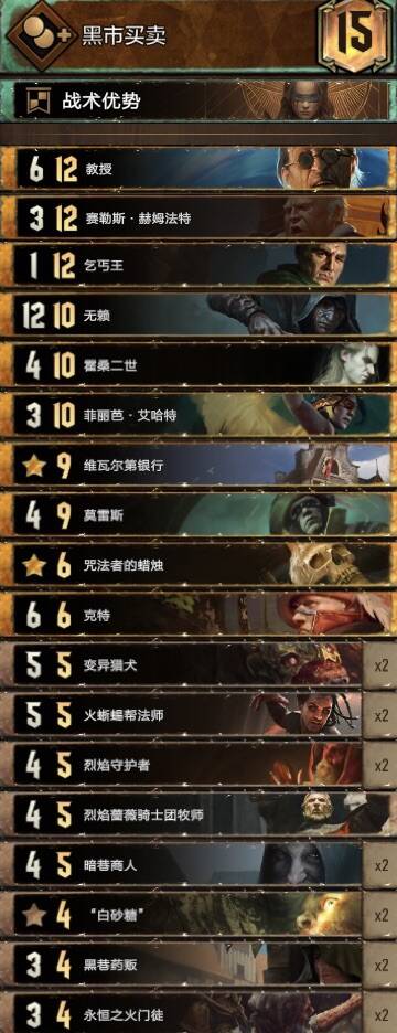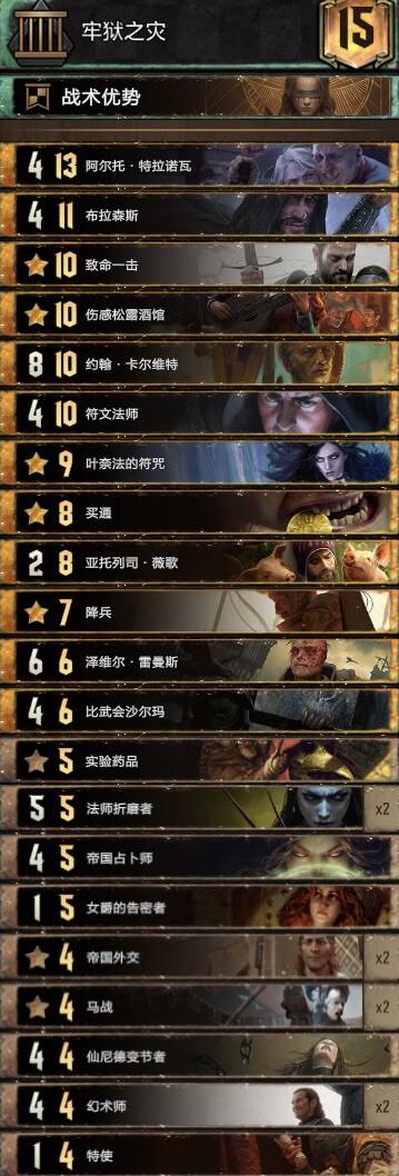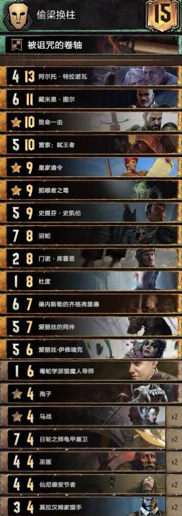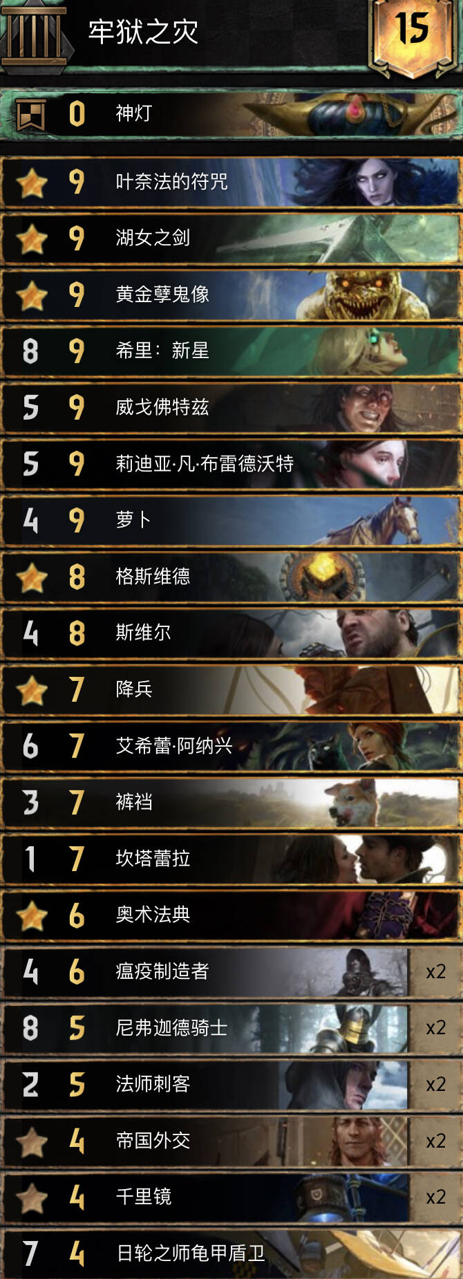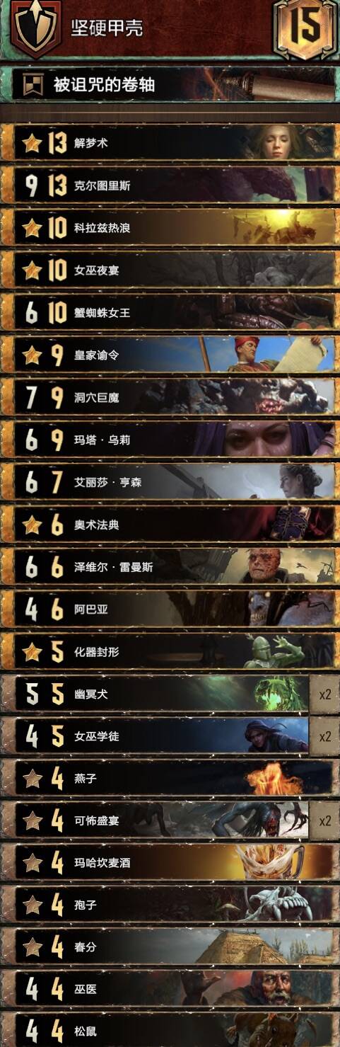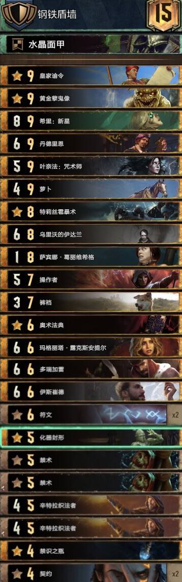 思路不复杂,主要围绕织法者进行的构筑,混进了两张禁术提升滚雪球能力,乌里沃的伊达兰可以配合操控者、符文与禁术,符文能为织法者一次提供两层充能,织法者、特莉丝冰雹和萨宾娜给科德温亡魂、禁术及叶奈法咒术师修点,丹德里恩主要是参考盾北的构筑,做为一张尚可的存点先手牌,提升一下织法者与叶奈法脆弱的身板,而且可以检测一下自己牌堆顶单位是啥拍孽鬼时心里有数但要注意可能会内鬼加萨宾娜血。由于是引擎卡组,一般多考虑打长局,希里在卡组中的重要性没有在其他孽鬼中那么明显,可以接受丢出去骗大解之类的。