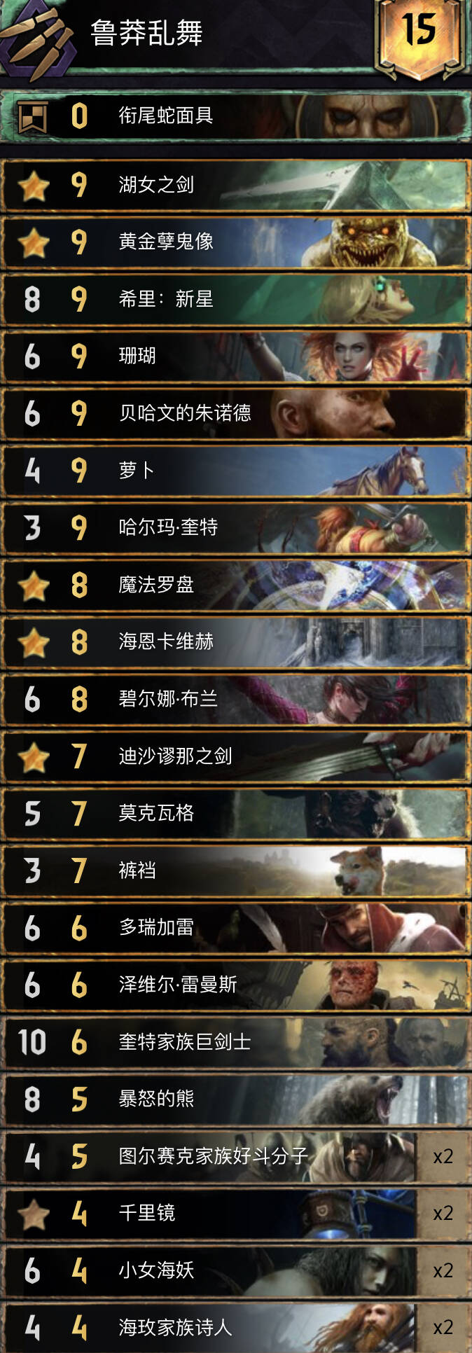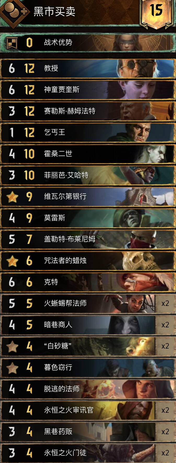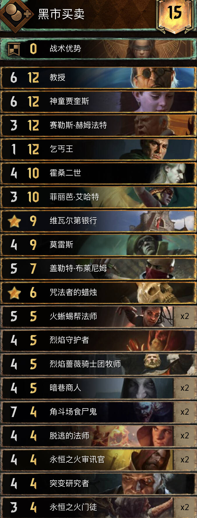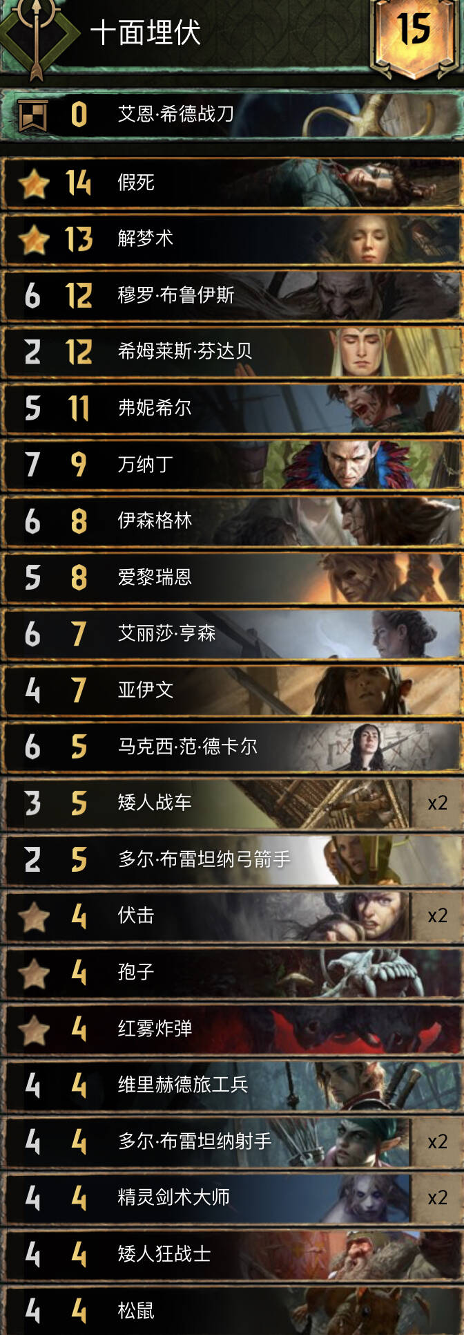 思路不复杂,主要围绕织法者进行的构筑,混进了两张禁术提升滚雪球能力,乌里沃的伊达兰可以配合操控者、符文与禁术,符文能为织法者一次提供两层充能,织法者、特莉丝冰雹和萨宾娜给科德温亡魂、禁术及叶奈法咒术师修点,丹德里恩主要是参考盾北的构筑,做为一张尚可的存点先手牌,提升一下织法者与叶奈法脆弱的身板,而且可以检测一下自己牌堆顶单位是啥拍孽鬼时心里有数但要注意可能会内鬼加萨宾娜血。由于是引擎卡组,一般多考虑打长局,希里在卡组中的重要性没有在其他孽鬼中那么明显,可以接受丢出去骗大解之类的。