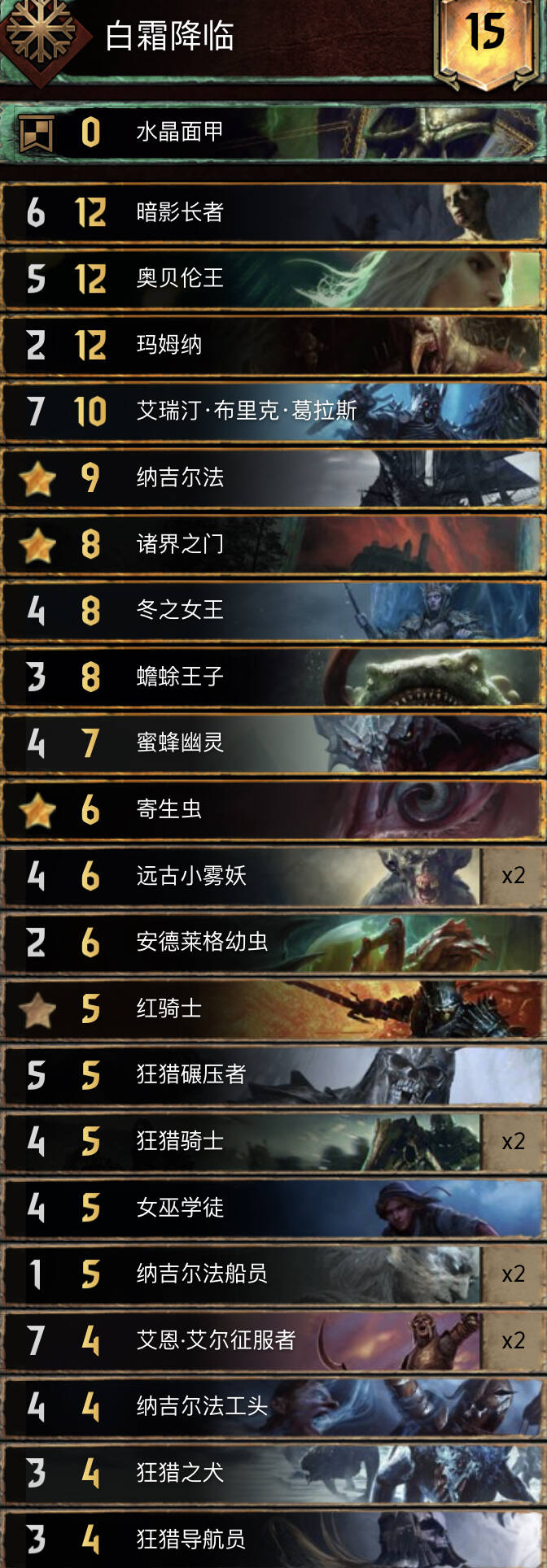 一般来说长局卡组的抗压和节奏能力都比较弱,但霜怪作为长局卡组虽然长局没有特别强,但抗压和节奏能力都是相当不错的,对战孽鬼卡组都是优势,尽可能赢下R1,打长局R3。需要注意在能赢下R1的情况下尽可能保证R3之前不要拉出女王(最理想是女王R1留在手上),如果R3女王在牌库里就可以把所有的霜叠在一排,这样有R3后手的情况下长局点数最大化且能避免绿字惩罚。当然赤诚怪兽的缺点依然是控制能力疲乏,遇到一些纯自闭长局卡组打长R3几乎没赢面,这个时候就需要R2逼牌,R3短局靠历变和马姆纳打爆发。幽灵和红骑士可以换成大锤之怒和一张4p补一些控制,但个人认为孽鬼当道的版本大锤之怒的作用微乎其微而且还卡手。