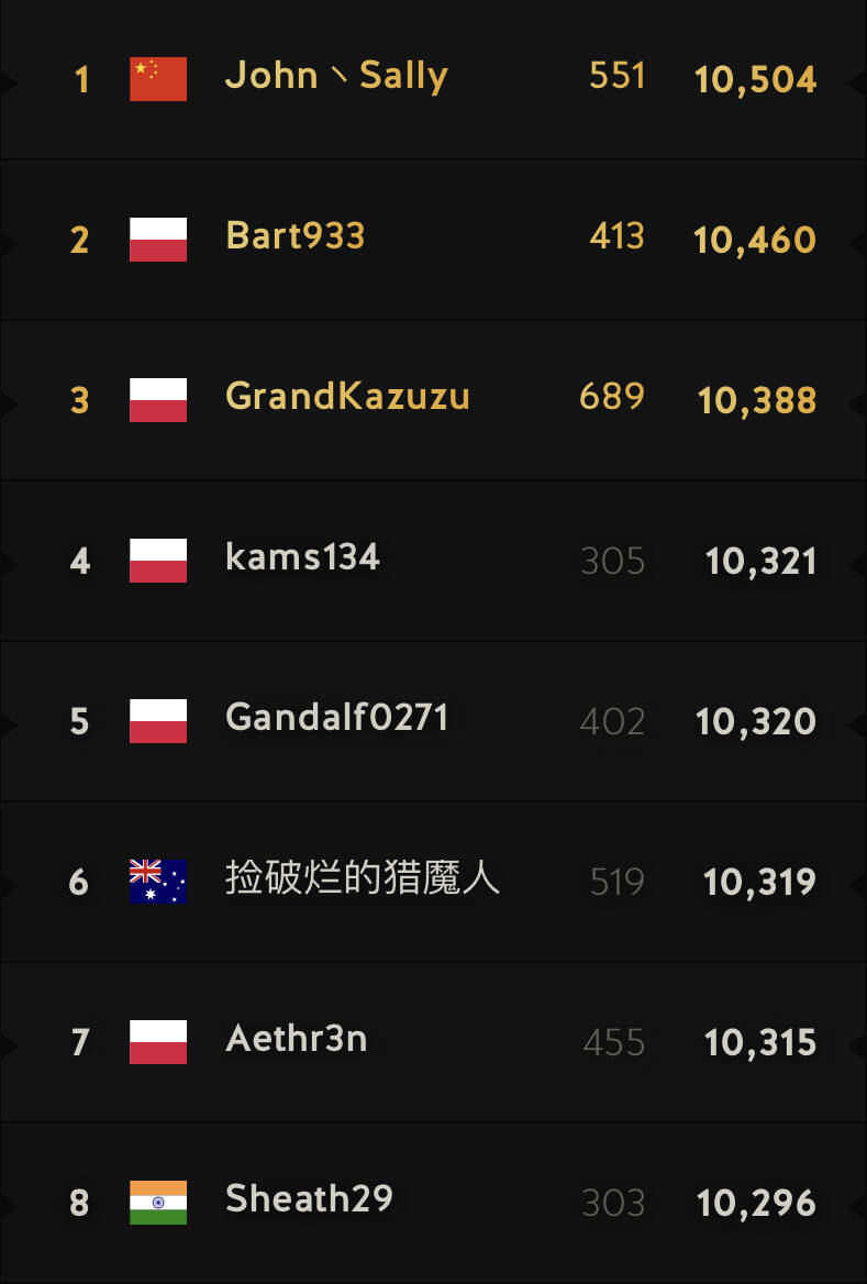 职天前八分数排名,JS暂时压制了5名波兰高玩,另一名国手“捡破烂的猎魔人”位居第六。