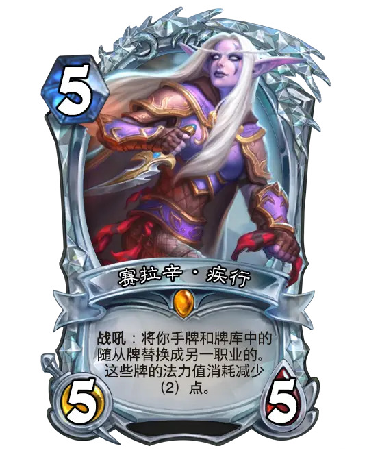 那么目前来看的话,我现在了解的情况就是赛拉辛疾行,这张牌是作为奥特兰克剽窃贼前瞻的第一步,这张其实已经超越了之前的构筑了,它发行的时候其实套路还少,但是未来的发展水平很值得期待,或者说有很大上限的,如果有机会的话,对这张牌的未来发展,可行性作一个全面的展望设想的讨论。那么目前来看它是会把所有随从变掉,那么就是说所有随从都不剩,那么就需要说,我们有没有必须还要保留的随从,那么这些随从是先打出去,然后拿回来,还是说打出去后,还是有办法再拿到手里,这是个重点,因为这都是剽窃贼的核心。那么其他随从就没有那么重要,本身是个体系就能打,换成别的牌,当剽窃依然可以展开,依然有挺高的强度。法术是不变的,所有法术都还在,所以未来的疾行剽窃的法术是重头戏,那么刚才看到出了一个“任意两张其他职业的5费以上的法术”,那么这就能看的到,疾行卡组下法术是重头戏,未来一定是大量的剽窃法术的,法术的问题是一次性,用过就没,不过能换资源也还好,但是也是比较耗费费用的,其实很容易亏费,费用价值会低,会有比较多的损耗,如果牌很差的话,还有模型的亏费,那甚至可能越打越差,随机性的模型下的模型越来越差,越来越不够,最后就是输。所以说还需要大量的控制法术,保证强度的法术,还有拉高上限的法术,这样保证前面换随从,中期保强度,后期超展开等等具体操作,达成一个综合全面的剽窃卡组。这样的话构成的是剽窃法术贼,法术为主体的,动态随机随从的,有强大随机性的,有一定控制性和动态调整的,能够有一定高上限,有可能带来较高上限的,下限基本能够相对保证的,强度适中的疾行剽窃贼。