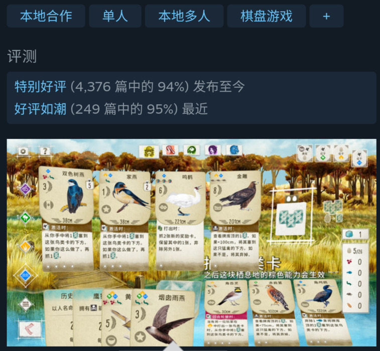 在完整搬运了桌游规则的基础上,还增加了鸟类动画和声效,从而深入强化了玩家对于鸟类观察者的代入。游戏优秀的单人模式也在电子平台上得到了很好的体现。