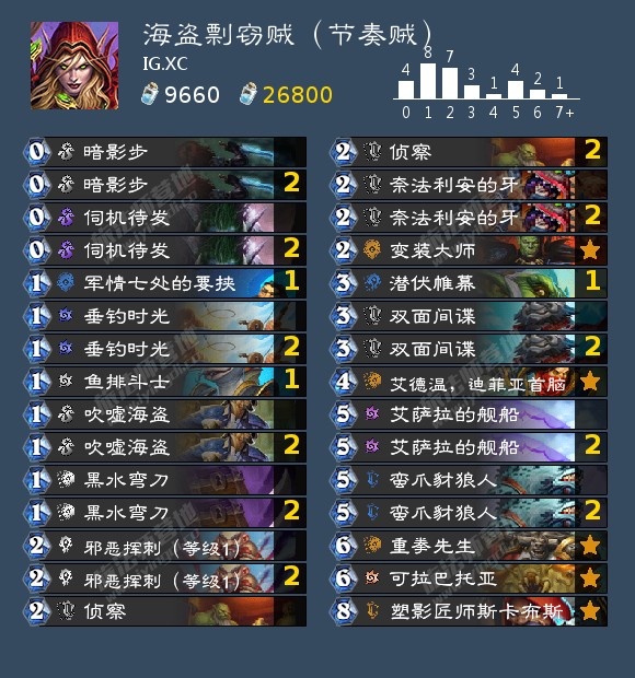 此时野猪牧的牌库由上到下分布为:0费的不朽护符(复活2),神圣祭司泽瑞拉,不朽护符(复活3),艾尔文野猪。正是这一只沉底的野猪(以及2血的狂野炎术师),导致菜喵最终无论如何无法在九费顺利提刀,好在贤菜此时显然被耗空了手牌质量,为了资源甚至暗影步了吹嘘海盗,而废料铁匠,本场比赛的真正主角就是在此时被随机了出来。