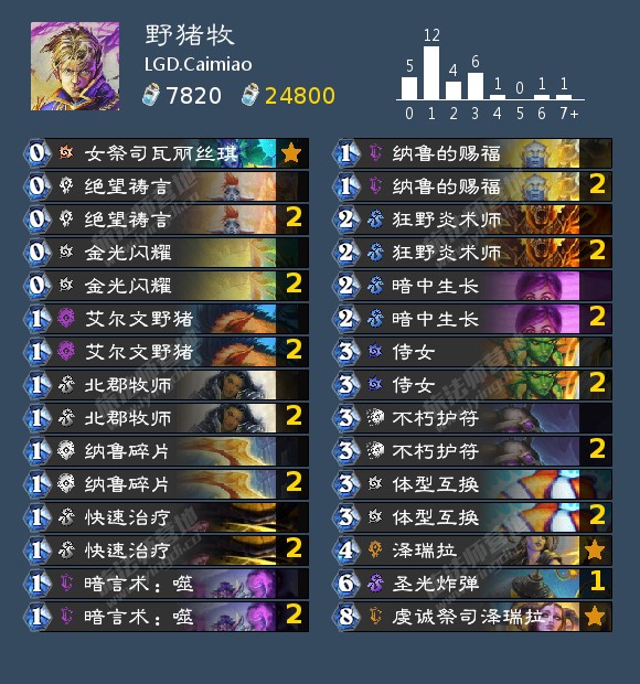 前期双方的你来我往倒没有什么特别值得说道的地方,贤菜按自己的手牌铺出一波又一波的场面,而菜喵的双侍女都及时上手了,他在5费交了一个侍女过牌,6费交了女祭司瓦丽丝琪和泽瑞拉,7费交出第二张侍女,狂野炎术师+北郡牧师+纳鲁的赐福直到8费才开始,菜喵的操作也并无问题,最大限度地过了5张牌。