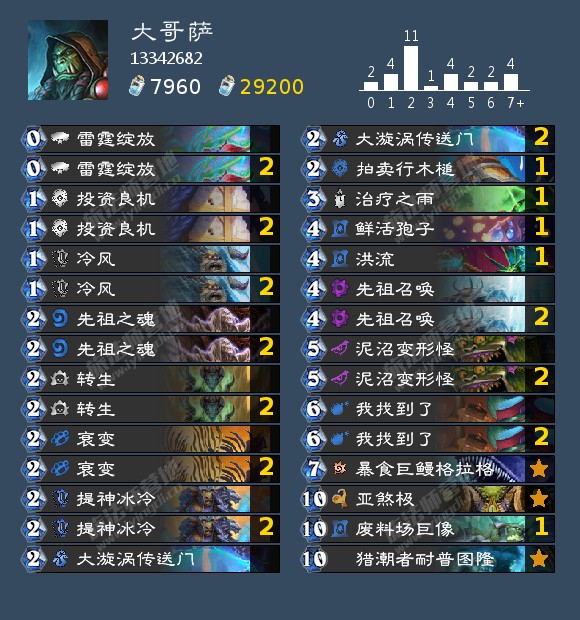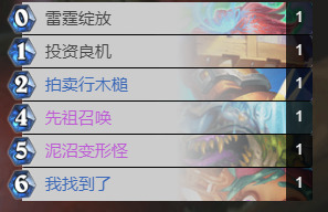 大哥萨的赢点简单粗暴就是拉大哥,起手留牌一般有两种,一种泥沼变形怪拉牌库大哥,另一种是先祖召唤和我找到了拉手牌大哥,所以当我们有先祖召唤和我找到了的时候,可以去根据对局去留大哥,打快攻时候一般留废料厂巨像和萨满巨型,打慢速的时候可以留新巨型和亚煞极,有泥沼变形怪可以留拍卖行木槌,2费木槌打两次就可以把泥沼变形怪减费成3费打出来了,雷霆绽放一般是会留的,为了搏胡,投资良机则是看手牌,比如你手里有先祖召唤或者我找到了可以1费打投资良机,2费雷霆先祖,根据自己的手牌能不能启动决定要不要留。