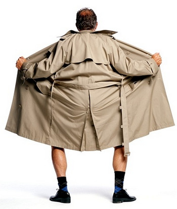 译注:这也是一个英语双关梗。据说60、70年代美国经常有嬉皮士吸了之后,裹着这种从一战流行起来的军式大风衣给路人露阴(就是那种朝人走过去“唰”地一下把衣服撩开,亮给路人看,姿势如下面这幅图),所以形成了穿这种大衣很可能是 露阴'癖 的一般印象,渐渐变成了一个梗。而英语里“亮出来给xx看”和“闪现”都是flash这个词,所以图里……就气氛奇怪了起来嘿嘿