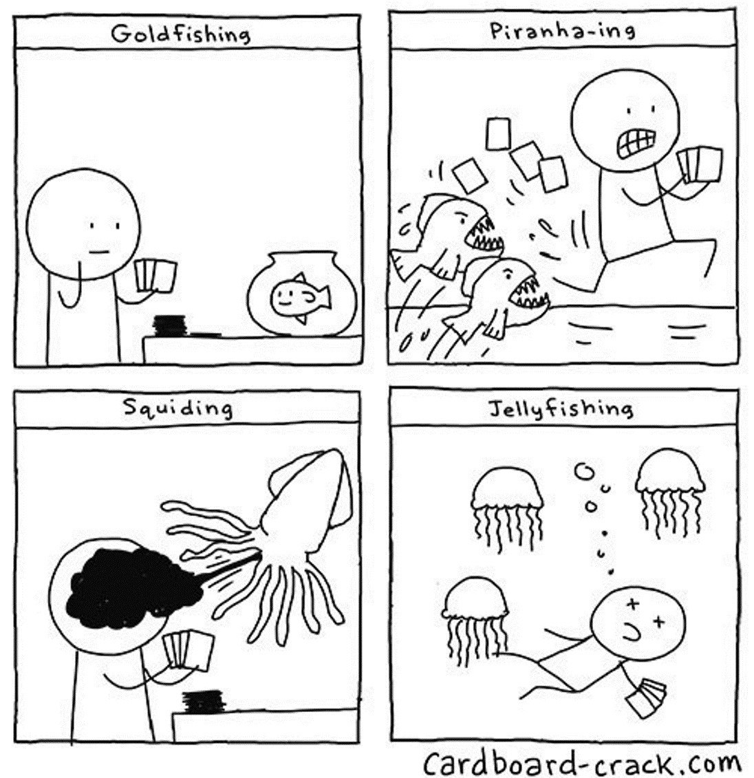 译注:这是一个英语摩登梗,指牌手为了测试套牌强度,假想自己跟一条金鱼对战,看看在对手像一条金鱼一样不干扰自己游戏计划的情况下,自己能多快击败对手。“金鱼”这个词于是就用来指这种模拟演练(goldfishing)。这幅漫画就是顺着这个词开个脑洞,试想如果把假想敌换成食人鱼、墨鱼等等,会是什么意境哈哈。中文翻译时创译了。