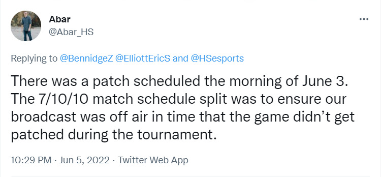 至于B组的赛程为什么要拆开来打,炉石电竞总经理Abar事后给出了解释,是因为第一天的晚些时候炉石有补丁/热修上线,所以那天的赛程要早点结束。这可是真正影响到竞技公平的“补丁背刺”了,相比之下迷你系列的突击和生物荧光的bug都算不上什么了……