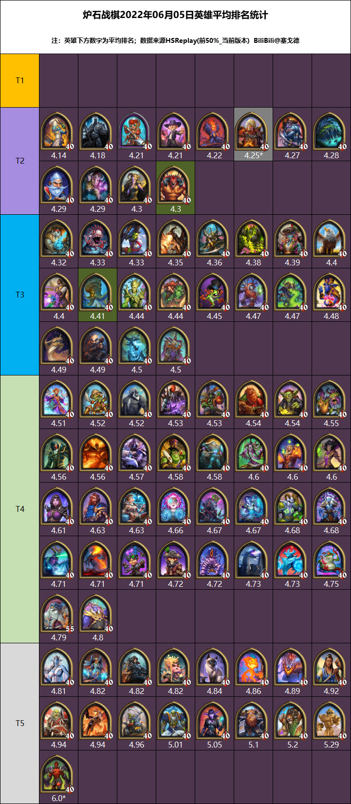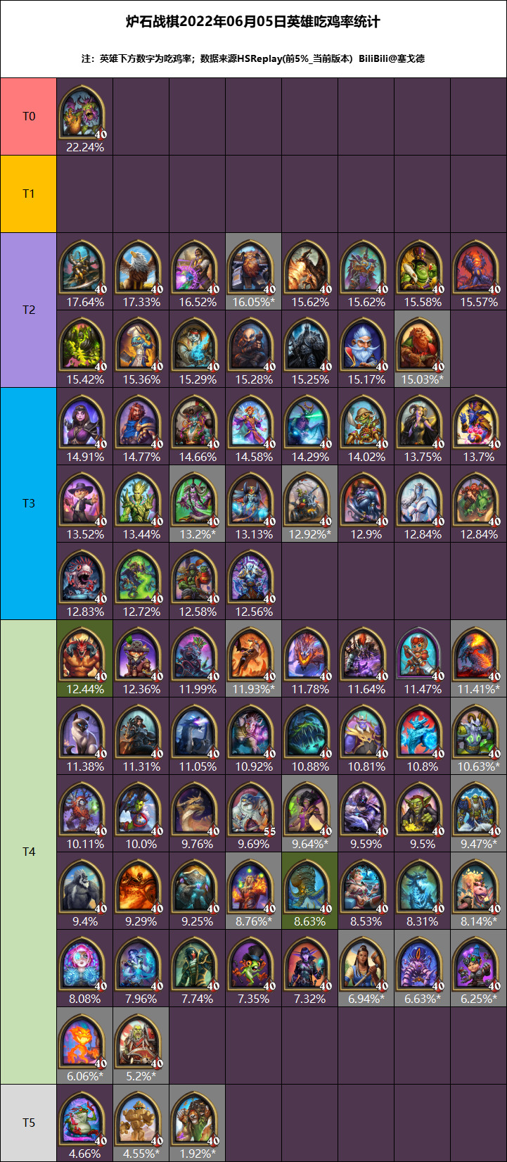 我先说一下,本次3日数据部分英雄在前1%的对局里根本统计不到,甚至连英雄头像都没有,所以我本次统计使用了前5%的分段。大菠萝的重新加入让环境再次洗牌,现在早期比较强力的英雄特别是保证4回合能拿到菠萝宝藏的英雄均场排名都不错,从而形成滚雪球的效应。除去数据不足的部分英雄,巫妖王几乎在所有分段都能排到前2名,算是他入驻酒馆以来最高光的时刻。