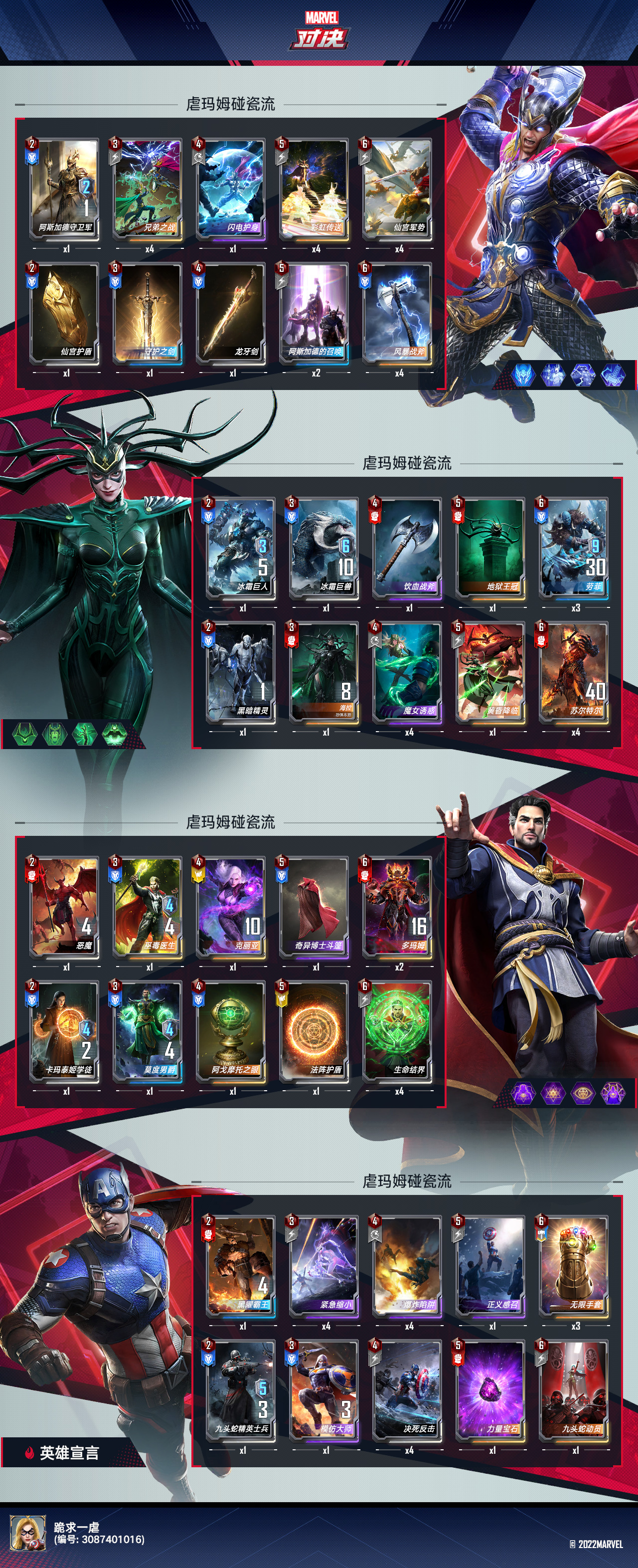 《漫威对决》这款游戏最大的魅力就是,你可以根据任意DIY自己的卡组,现在有12个英雄了,理论上的卡组组合有220种: